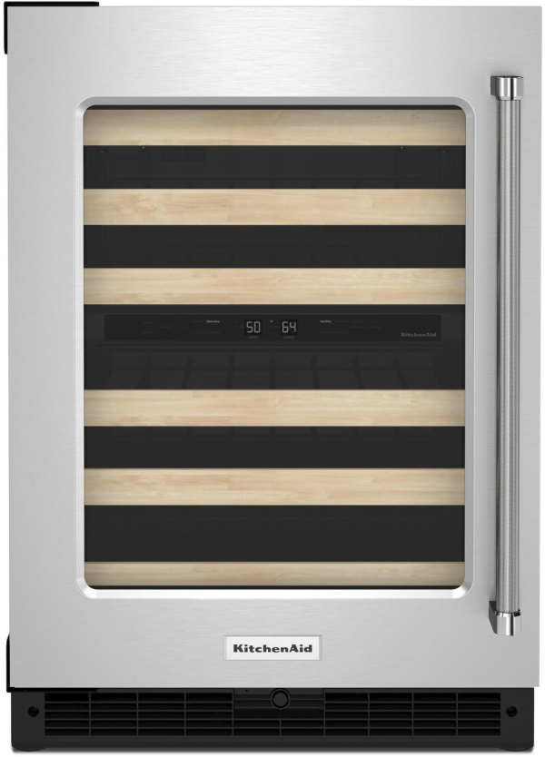 This under-counter wine cellar with full-extension wood-front racks holds up to 46 standard Bordeaux-size bottles. Two temperature-controlled zones let you separate reds and whites to store each at the temperature you enjoy, and motion-activated LED lighting turns on as you approach, making it easy to see what’s inside.Read More