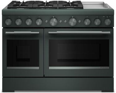 Satisfy your craving to create with a 48-inch KitchenAid® Commercial-Style Range with Chrome Electric Griddle. This dual fuel range combines an electric double oven with a 6-burner gas cooktop. Two 20,000 BTU Ultra Power™ Dual-Flame Burners offer power and precision to successfully sear, simmer, stir-fry and sauté. Even-Heat™ True Convection gives consistent baking and roasting, plus air fry mode that yields crispy, golden results.Read More